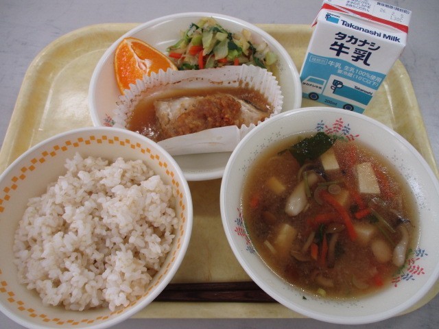 五分づき米 たらの麦みそ焼き じゃこ入りおひたし なめこのみぞれ汁 はるみ ぎゅうにゅう