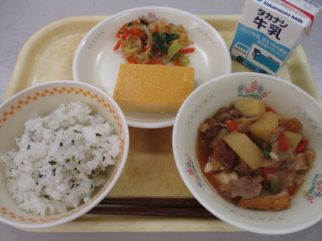 菜めし 厚焼きたまご こまつなのおかか和え 油ふ入り肉じゃが ぎゅうにゅう