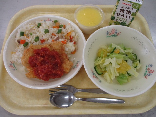 色々なお豆とお米のリゾピラフ 鶏肉のミラノ風カツレツ フレンチサラダ パンナコッタ~パイナップルソース~ 白ぶどうジュース