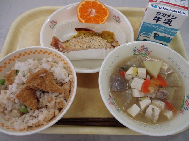 こぎつねごはん 鮭のマヨネーズ焼き 豚汁 ぽんかん ぎゅうにゅう