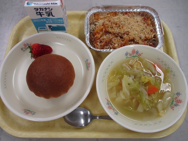 ブリオッシュパン リボンマカロニのラザニア風 洋風スープ いちご ぎゅうにゅう
