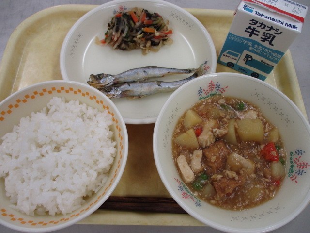 ごはん 新じゃがのそぼろに やきししゃも シャキシャキ梅サラダ ぎゅうにゅう