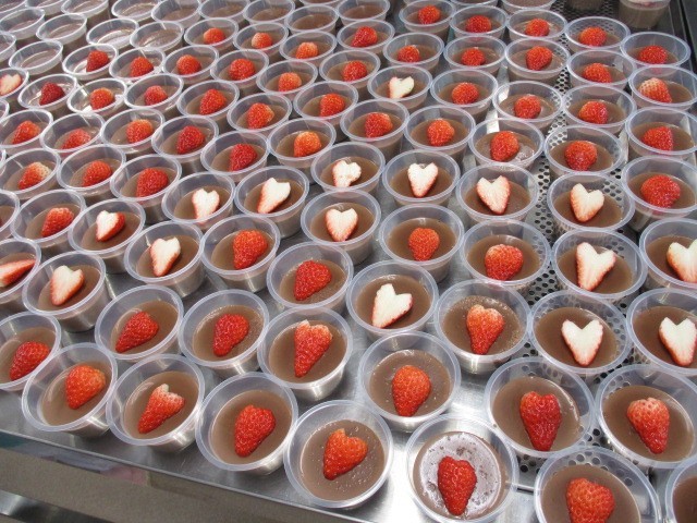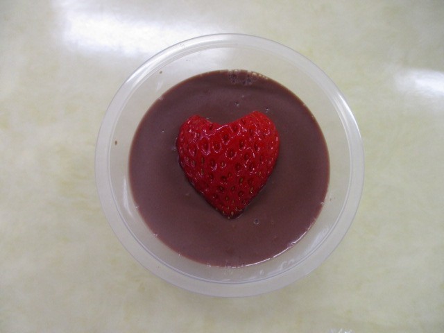 今日は、給食委員さんが実施してくれた「リクエスト給食アンケート」の第1弾です!2学期にとったアンケートの「デザート部門」で見事第2位に輝いた、大人気の「チョコババロア(チョコプリン)」が登場しました。牛乳、ココア、生クリーム、ゼラチンなどを使い、給食室で一つひとつ丁寧に手作りした自信作です。明日のホワイトデーに合わせ、約500個のいちごを、調理員さんが型や包丁を駆使して「ハート型」や「飾り切り」に仕上げてトッピングしました。配膳の時間、食缶のふたを開けた6年生からは「わあ!」と大きな歓声が!さらに「お家でも作ってみたい!」という嬉しい声も聞こえてきました。メインの「スパゲティミートソース」とともに、目でも舌でも楽しめる特別な時間を過ごせたようです。給食室からの愛情たっぷりのデザート、みんなの心に届いたでしょうか。