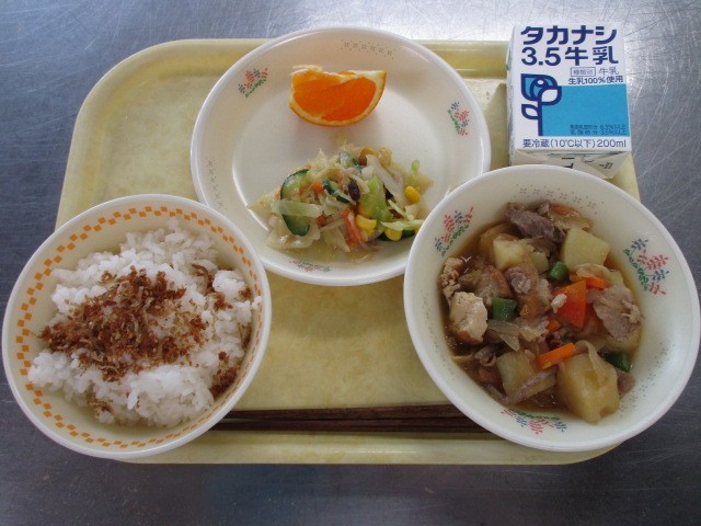 今日の献立「ごはん・かつおふりかけ、油麩入り肉じゃが、豆と雑穀入りみそドレッシング、清見オレンジ、牛乳」