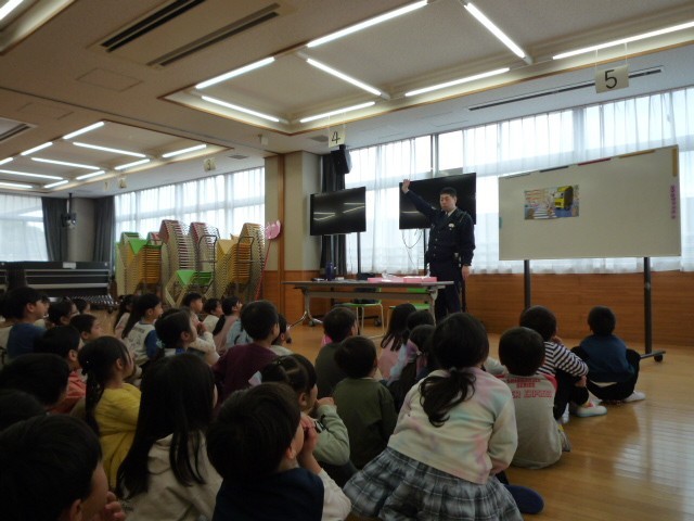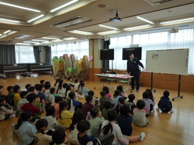 日頃、図師小学校の地域でお世話になっているおまわりさんから、1年生が交通安全についてのお話を伺いました。安全な登下校のために気を付けるべき大切なポイントをたくさん教わりました。おまわりさんのお話にしっかりと耳を傾け、問題や質問には多くの子供たちが積極的に答えていました。これから長く続いていく学校への登下校が、毎日安全なものであるよう心より願っております。