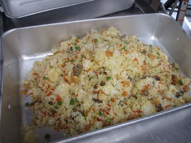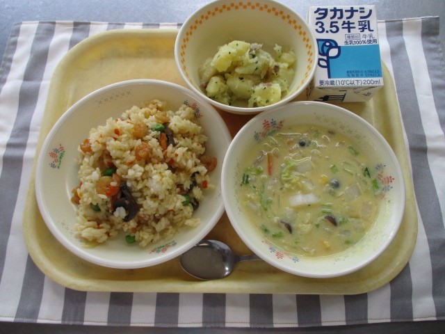 【今日の献立】エビピラフ、とうもろこしの豆乳スープ、ジャーマンポテト、牛乳