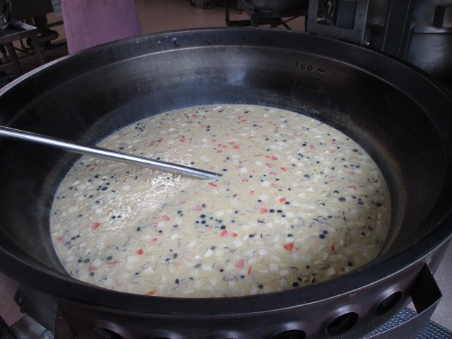 今日のスープは、みなさんの体を包み込む「豆乳」を使いました。大豆から作られる豆乳は、体を作るたんぱく質がたっぷりで、牛乳よりもさらっとした飲みごこちが特徴です。とうもろこしの自然な甘みと合わせることで、ホッとするようなコクのある味に仕上げました。