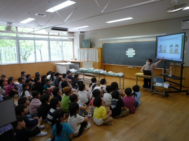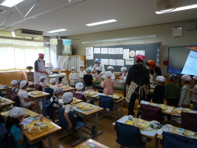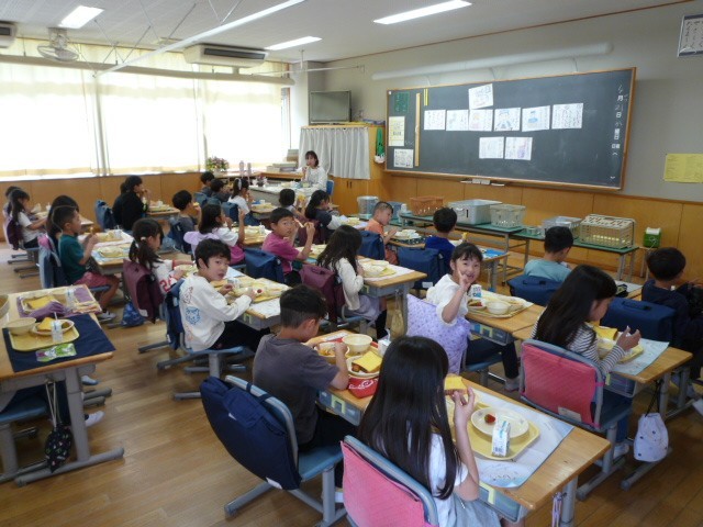 本日より、楽しみにしていた1年生の給食が始まりました。給食の前に、まずは4時間目に栄養士から配膳の約束や食べる時のマナーについてお話を聞きました。そしていよいよ給食の時間。皆、教わったことをしっかりと守り、スムーズに準備を進めることができました。今日のメニューは子供たちに人気のフレンチトーストです。小学校に入学して初めての給食の時間は、どちらの教室でも、うれしそうな笑顔がたくさん見られていました。