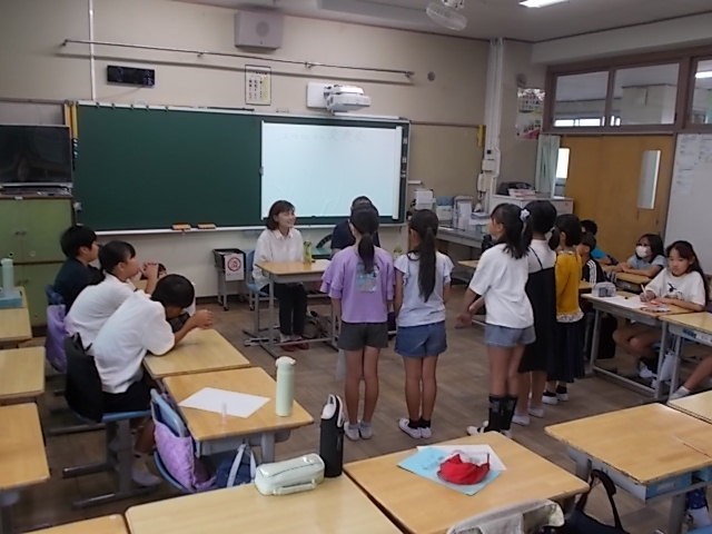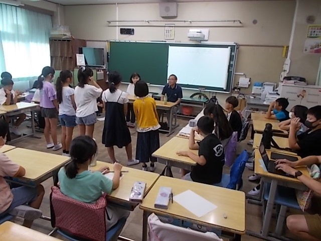 今日は、地域に住んでいらっしゃる視覚障害の方にお越しいただき、子供たちの質問に答えていただきました。