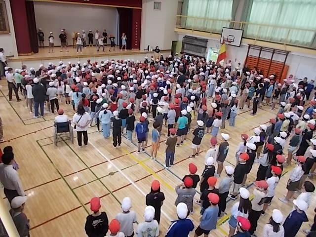 今日の児童集会は、運動会に向けて、応援団の紹介、歌の練習、運動会のスローガンの発表でした。