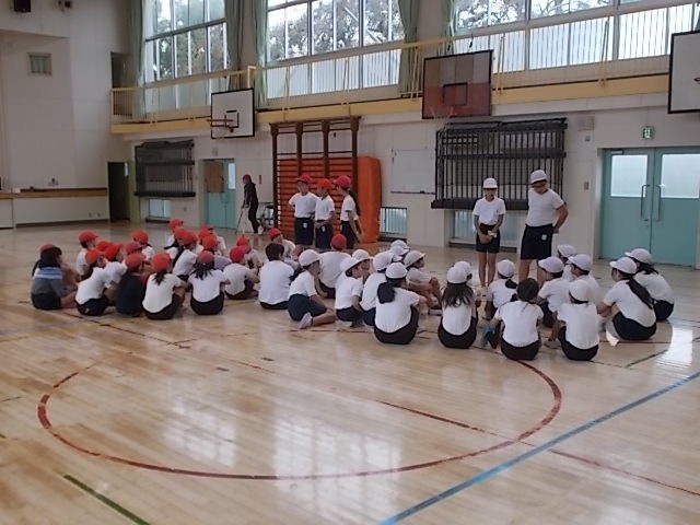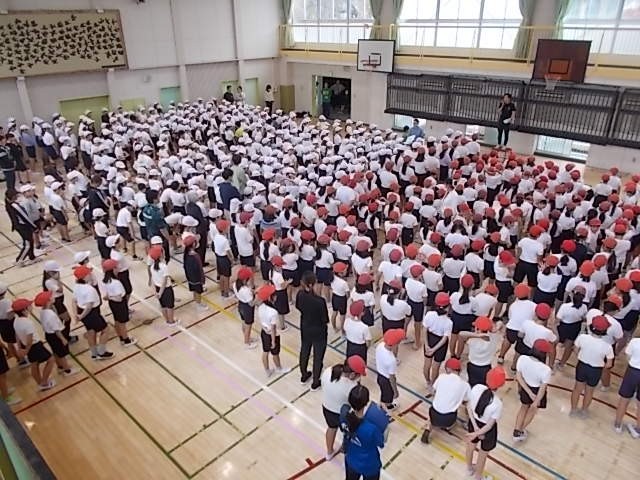 校庭がぬかるんでいるので、体育館で全校練習を行いました。