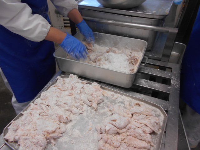 フライドチキンは、油で揚げる直前に、1枚1枚丁寧に衣付けしています。そのため表面がカリカリに仕上がります。
