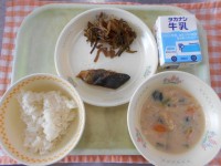 <献立>牛乳ごはんほっけのスタミナ焼き茎わかめのきんぴら豆乳入りみそ汁茎わかめは...