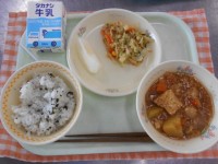 <献立>牛乳ごはんじゃがいものそぼろ煮味噌ドレッシングサラダ果物(なし)給食のサ...