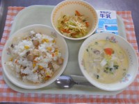 <献立>牛乳ウインナーとコーンのピラフカリカリポテトサラダかぶのクリームスープサラダには、せん切りにしたじゃがいもを油でカリカリに揚げて作ったポテトが入っています。子どもたちが食べるときに、カリカリと...