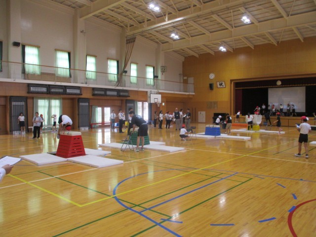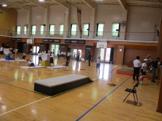 5年生の学級ではアリーナ全体を使って跳び箱運動の授業を行いました。