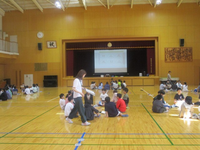 ・6年生 アリーナで外国語の授業自分の好きな動物や食べ物について紹介し合っている様子