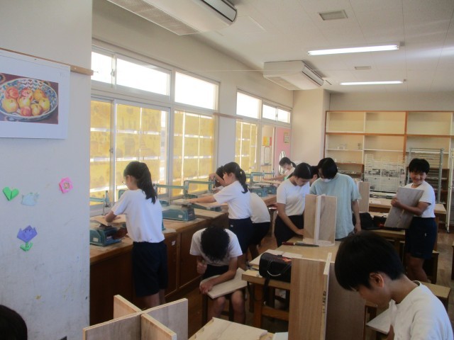 ・6年3組 電動のこぎりを使用して作品展に向けて木工作品を制作している様子