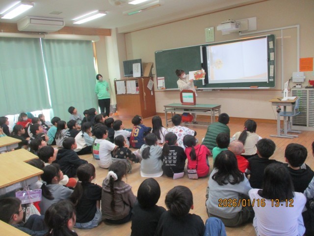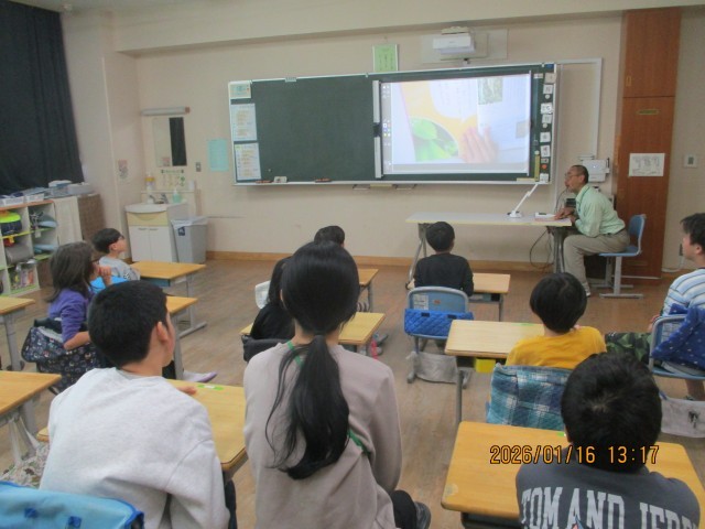 今日はモジュールの時間に1年生から4年生で「おはなし会」の読み聞かせがありました。