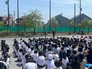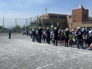 今日は今年度初めての避難訓練を行いました。火災の想定だったため、防災頭巾を被り、ハンカチで口元を押さえながら安全に避難しました。これから毎月の訓練を通して、自分の身は自分で守る力を育てていきたいと思います。
