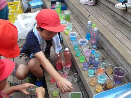 ある人はたまごパックをカラフルにぬり分けキラりんを、ある人はスズランテープを切ってパックに付けてゆらりんを、それぞれのカップに違う色の水を入れて重ねている人もいました。友達と協力して一緒に作り上げたり、鑑賞タイムで見つけたナイスキラりん・ゆらりんを参考にさらにアイデアを広げたり…あっという間に時間が過ぎ、素敵ながおかランドが出来上がりました。
