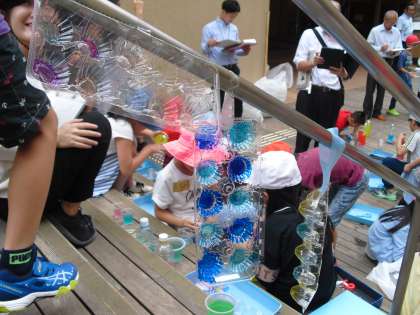 いつも見慣れている景色を、同じプラスチック素材のたまごパックやペットボトル、カップなどを使って、「がおかランド」に変身させるというものです。光を感じられる「キラりん」や風を生かした「ゆらりん」を中心に、どこに何をどうやって飾ろうか?子ども達のイメージはふくらみます。