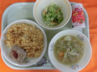 ターメリックライスチキンと豆のカレーキャベツサラダ果物(紅マドンナ)牛乳