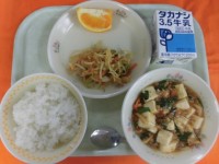 ごはんマーボー豆腐ポテト入りナムル果物(清美オレンジ)牛乳