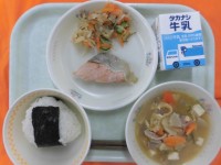 おにぎり鮭の塩焼き野菜の昆布和え豚汁牛乳