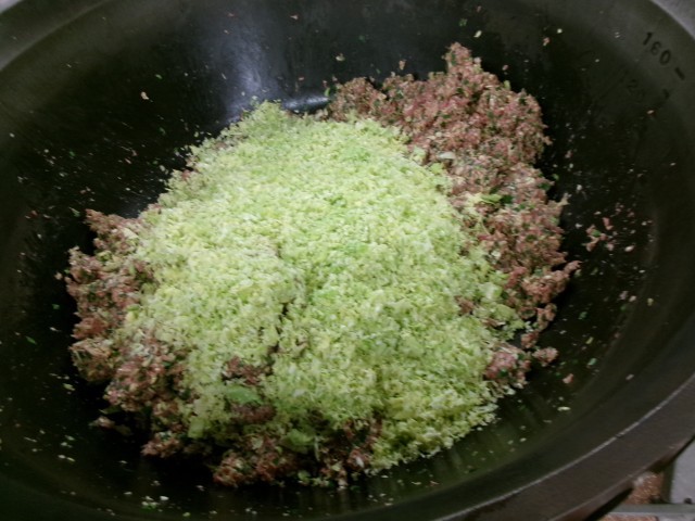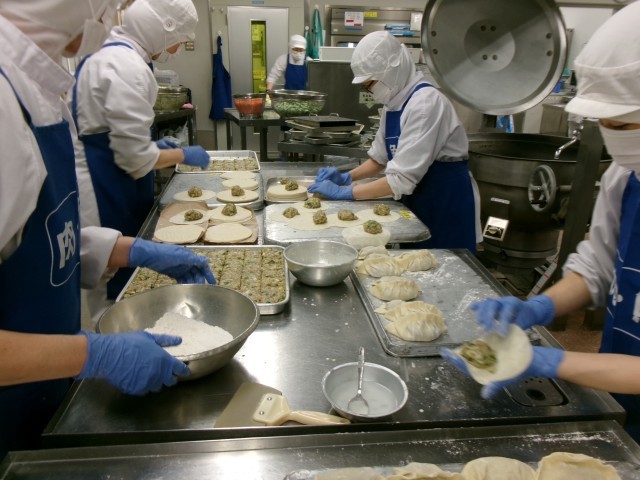 今日は給食の人気メニューのひとつジャンボ餃子で、6年生のリクエスト給食メニューのひとつです。ジャンボ餃子は、直径15センチの大きな皮を使って作っています。餃子のなかみは、豚肉、にら、キャベツ、春雨と具だくさんです。今日のジャンボ餃子は、調理員さんがひとつひとつ皮にあんを丁寧に包んで、油で揚げて作りました。