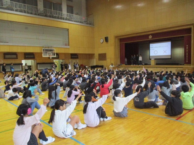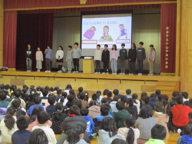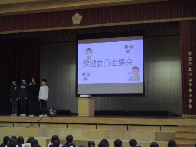 保健委員会集会がありました。保健委員が全校に向けてクイズを発表しました。