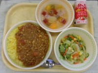 日本味めぐり給食で栃木県の料理を作りました。餃子めしは、餃子の具をご飯に混ぜた料理で、栃木県の給食でも人気のある献立だそうです。芋フライは、栃木県佐野市の名物料理です。蒸したじゃが芋にフライ衣を付けて油で揚げて作ります。佐野市では芋フライがお団子のように竹串にささった状態で売られていて、お昼ご飯やおやつに食べることが多いそうです。今日は栃木県の料理を味わっていただきました。