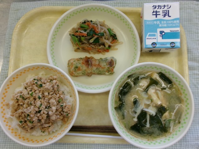 今日の「スタミナ納豆」は、鳥取県発祥のメニューです。鳥取県では、給食の人気メニューのひとつで、給食だけではなく、家でもよく食べられているようです。ただの納豆とは違い、甘辛く味付けをした鶏のひき肉に、ひき割り納豆を混ぜ合わせたもので、ご飯にかけて食べます。納豆を食べやすく味付けしていますので、納豆が苦手な人も、ぜひ一口食べてみてくださいと、声かけしました。