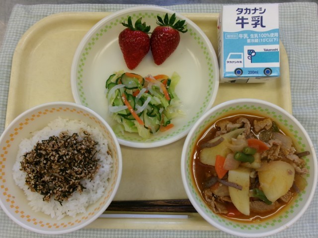 今日のふりかけには、めかぶを使いました。めかぶはわかめの一部で、わかめの根本の部分にある葉や茎が固くなっている部分です。めかぶの栄養では、食物繊維やミネラルが多く含まれていて、体の調子を整えてくれる働きがあります。めかぶは、酢の物や味噌汁の食材に使うこともありますが、そのまま食べてもおいしいです。給食では、乾燥めかぶを使って栄養たっぷりのふりかけを作りました。