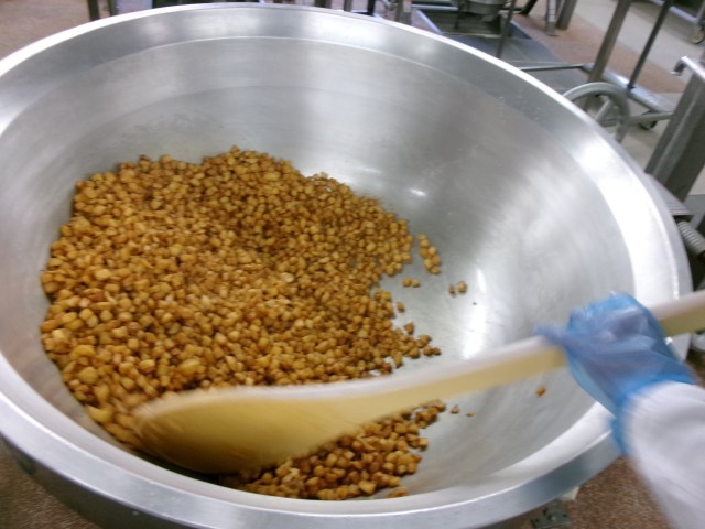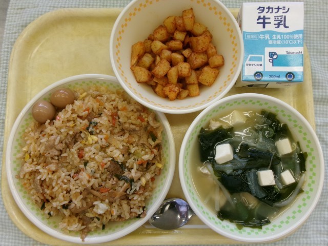 今日は、韓国料理の「プルコギ」をご飯と混ぜて、プルコギチャーハンにしてみました。「プルコギ」は韓国で人気の肉料理で、しょうゆベースの甘辛いたれで味付けした肉を専用の鉄板で焼いて食べます。韓国語で「プル」は火、「コギ」には肉という意味があります。今日の給食のプルコギチャーハンは、肉も野菜も一緒に食べられるので栄養満点です。