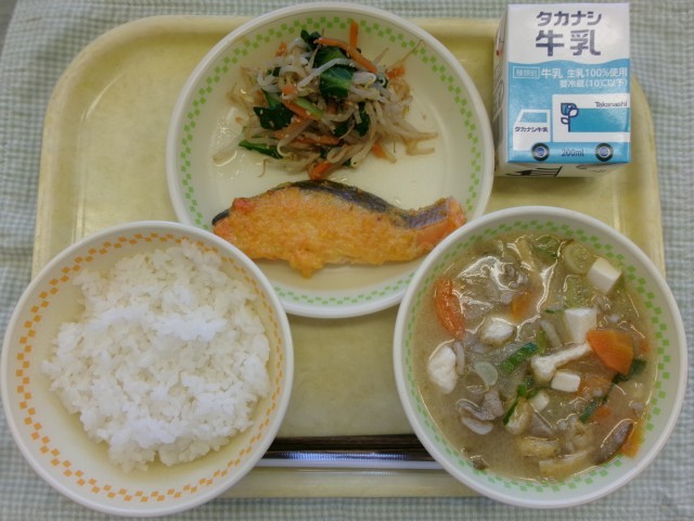今日は鮭の切り身であけぼの焼きを作りました。あけぼの焼きのあけぼのとは、冬から春の明け方の空の様子のことで、薄いピンクや薄い赤の色がついた料理のことをいいます。今日の給食では、あけぼのの様子をすりおろした人参とマヨネーズを混ぜたもので表現しています。あけぼの焼きは、見た目がきれいなだけではなく、栄養たっぷりでおいしいです。