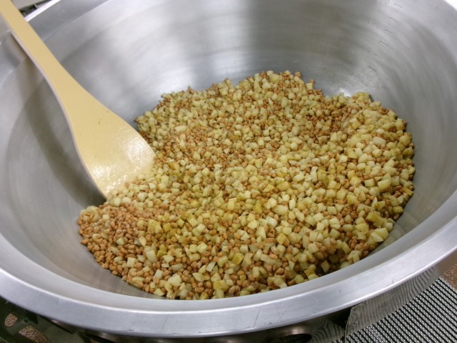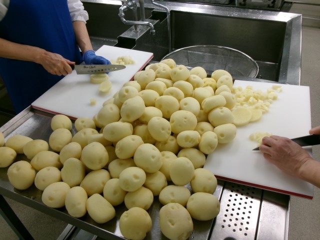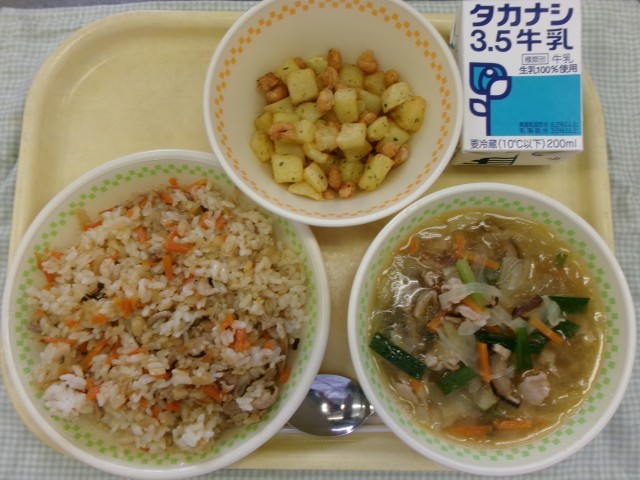 4月の給食目標は「たのしく食事をしよう」です。クラスのみんなで、給食の準備を協力して行い、楽しい給食時間が過ごせるようにしましょう。給食当番の人は、白衣・帽子・マスクの身支度を整え、手を洗ってから配膳を行うようにしてください。今日は、大豆を使ってカレービーンズポテトを作りました。大豆は、体をつくる栄養の「たんぱく質」が多くふくまれています。よくかんで食べてくださいと、おはなししました。
