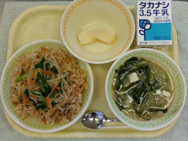 4月の給食も残り1日となりました。どのクラスも協力して給食の準備ができているようです。給食の前に手を石けんで洗い、きれいなハンカチでふくことを忘れずに行うようお話ししました。今日の給食はビビンバです。ご飯の上にナムルをのせて、まぜながら食べました。