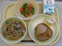 今日はサラダに茎わかめを使いました。茎わかめは、わかめの葉の芯の部分です。コリコリとした歯ごたえが特徴です。また、茎わかめには、おなかのそうじをしてくれる食物繊維がたくさん入っています。よくかんで食べるようにおしらせしました。今日のデザートの河内晩柑は、見た目はすっぱそうですが、酸味は弱くさわやかな甘さでおいしい果物です。