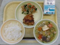 今日は、新じゃが、新玉ねぎ、たけのこ、ふきの4種類の春野菜を使って春野菜の煮物を作りました。春野菜の中でも、新玉ねぎは、収穫後約1か月乾燥させて出荷する通常の玉ねぎに対して、乾燥させずにすぐ出荷されることから、みずみずしくてやわらかく、からみが少ないのが特徴です。煮物の中の春野菜を見つけながら食べてみてくださいと、声かけしました。