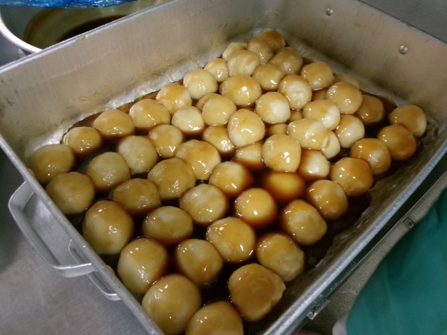 前期最後の給食は、アップルポテトパイを手作りしました。アップルポテトパイは、さつま芋をゆでてつぶして、砂糖とりんご缶のりんごを混ぜたものを餃子の皮に包んで油で揚げたものです。さつま芋とりんごの甘さでおいしく仕上がっています。うずらの卵はしょうゆで煮ました。慌てずよくかんでゆっくり食べてくださいと、声かけしました。