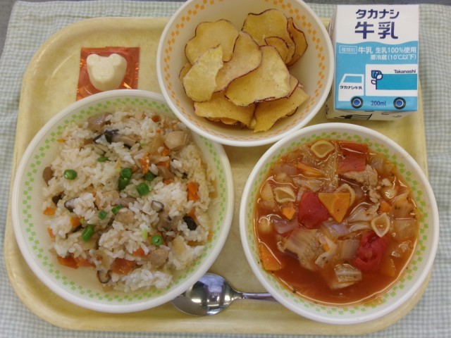 今日は、牛乳、卵、砂糖を混ぜた液の中にパンをひたして、オーブンで焼いたフレンチトーストを作りました。ほんのり甘くておいしいです。フレンチトーストは、卵や牛乳が使われているので栄養も満点です。また、さつ豆サラダは、名前の通り、さつま芋とひよこ豆が入ったサラダです。よくかんで食べてくださいと、声かけしました。
