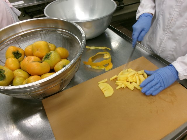 柿は、秋が旬で、奈良時代から作られている歴史の古い果物です。柿にはビタミンAとCが多く含まれていて、風邪予防や咳止めに効くと言われています。さらに柿は、実を食べて、葉・へたは薬やお茶として使われ、栄養が多いことから、「柿が赤くなれば医者が青くなる」ということわざもあります。今日は柿をサラダに入れました。柿サラダを食べて旬を味わいましょうと、お知らせしました。