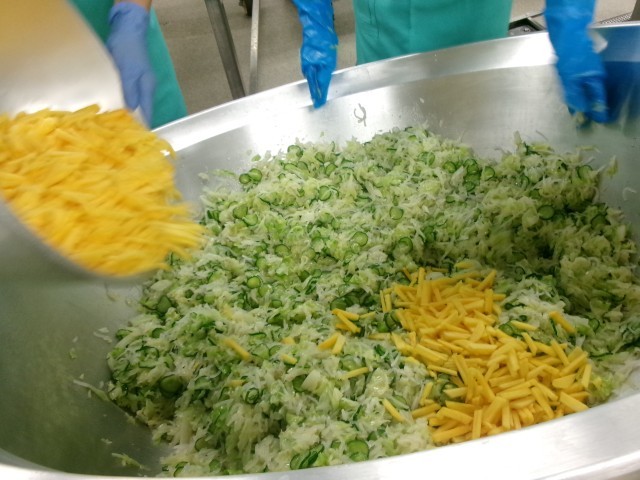 今日の汁物は、沢煮椀です。沢煮椀の「沢」には、「たくさん」という意味があります。沢煮椀は、千切りにしたたくさんの野菜や豚肉を使って作った汁物のことです。今日の沢煮椀は、かつおの厚削りから丁寧にとっただしと、スープに溶けだした野菜のうま味でおいしく仕上がりました。だしも味わいながら食べてくださいと、声かけしました。
