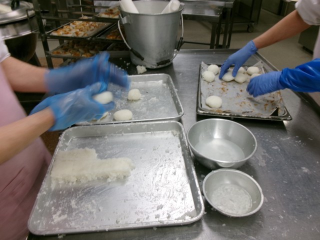 今日は十五夜にちなんだメニューです。十五夜は、別名「中秋の名月」といい、きれいな月をながめて楽しむ習慣があります。また、すすきを飾り、お団子やさといもなどをお供えし、収穫への感謝と豊作を祈るお祭りでもあります。給食では、みたらしのたれをかけたお月見団子を手作りしました。