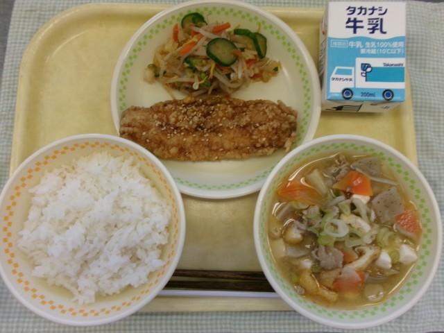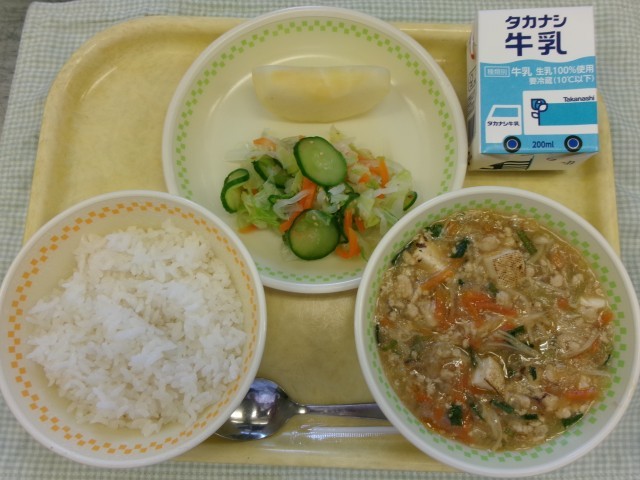 今日は、旬の果物のりんごをサラダに入れました。りんごは、世界中で古くから食べられている果物で、最近は、たくさんの種類のりんごが出回っています。今日の給食のサラダには、サンふじのりんごを使いました。疲れた筋肉には「乳酸」という物質がたまるのですが、りんごには、その乳酸を分解してエネルギーにかえる「リンゴ酸」という栄養が含まれています。今日のサラダをおいしく食べて運動会の練習の疲れをふき飛ばしましょう!と、声かけしました。