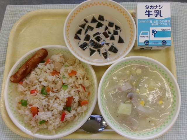 明日はいよいよ運動会本番ですね。給食では、「ガンバルゾー」にかけて、別名英語読みで「ガルバンゾー」と呼ばれるひよこ豆を使って「ガルバンゾーカレーライス」を作りました。デザートはさっぱりとおいしいぶどうゼリーです。今まで練習した成果を発揮できるようにみなさん頑張ってくださいと、声かけしました。