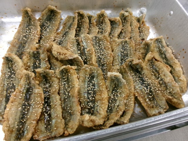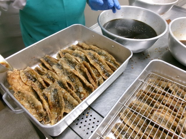 今日は、秋が旬のさんまを蒲焼きにしました。蒲焼きとは、身の長い魚を開いて、骨を取って、串にさして焼いたものに、甘辛いたれをつける魚料理のことをいいます。江戸時代から食べられている調理法のようです。給食では、お店のようにひとつひとつ串にさすことは出来ないので、開いたさんまを油で揚げて、甘辛いたれをからめました。