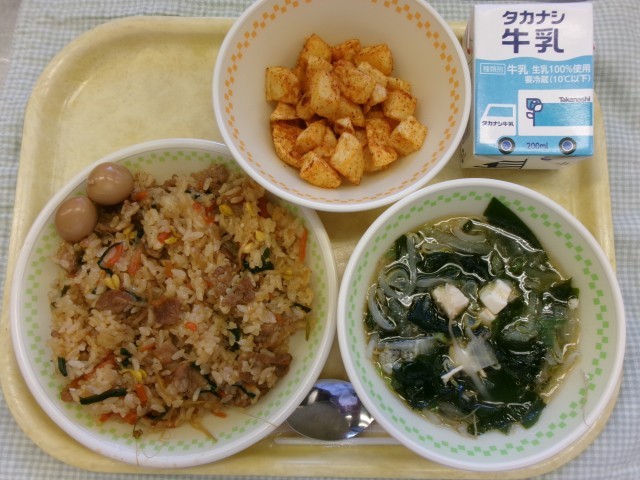 今日から14日までの2週間は「秋の読書週間」です。そこで、今年も図書館にある本に関係するメニューを給食に登場させる「おはなし給食」を実施します。この機会にいろいろな本を読んで、読書の秋を楽しみましょう。今日のおはなし給食は「じゃがいもポテトくん」よりじゃが芋を使って「スパイシーポテト」を作りました。北の国からやってきたじゃがいも家族のお話です、じゃがいも家族の名前もゆかいで楽しいお話です。