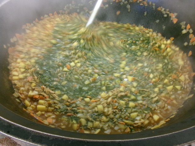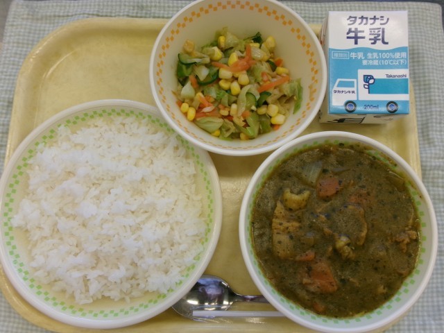 今日はほうれん草のカレーライスです。ほうれん草は、11月から2月にかけて旬を迎えます。旬のほうれん草は、収穫量も多く、栄養価も高く、味も良いとされています。給食では、今が旬のおいしいほうれん草を、ゆでてミキサーにかけてからカレーに入れました。ほうれん草が苦手な人も食べやすく仕上がっていると思います。栄養満点のほうれん草のカレーをおいしく食べてくださいと、お伝えしました。